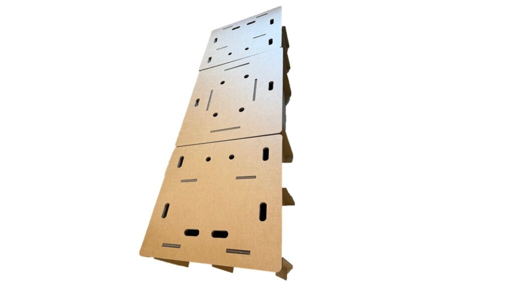 特徴としては一般ダンボールWFで十分な強度を持たす設計構造とベッド面を面で受ける部分は折れや曲げに対して強い強度を持つ強化ダンボールを組み合わせることで、強度とコスト両面での大きなメリットをご提供することができるんです。